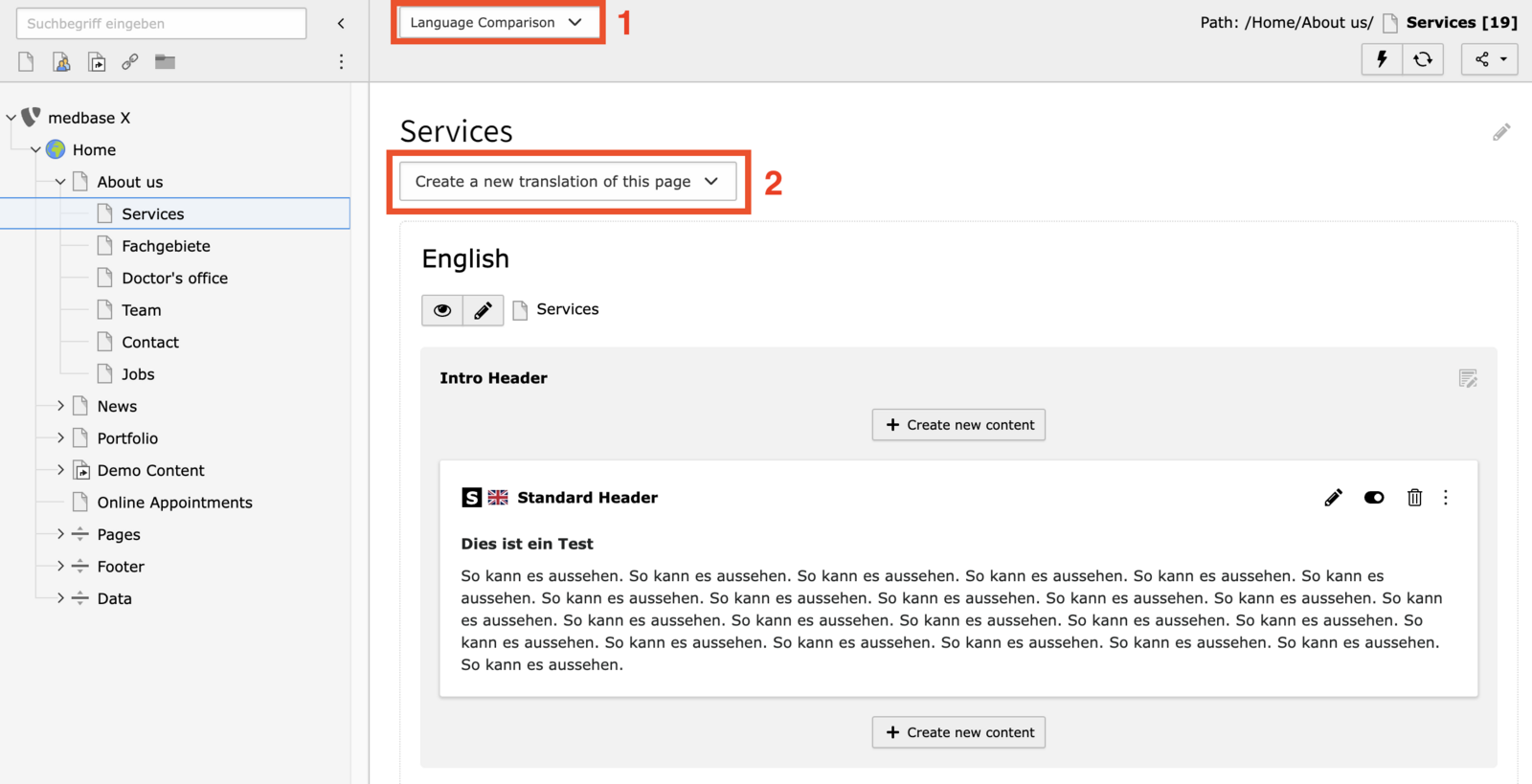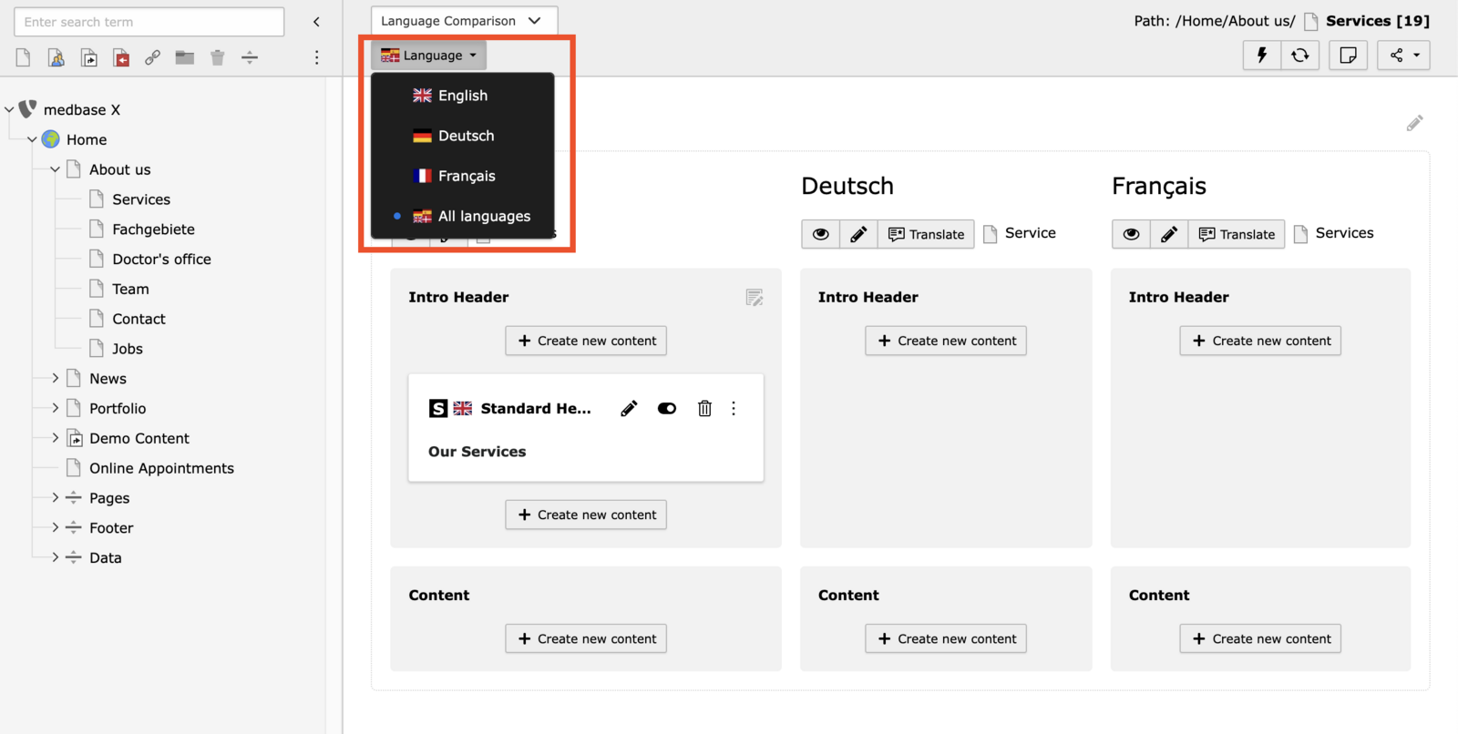 In the language switch, you can switch between translated versions of the page or display all translated languages next to each other.